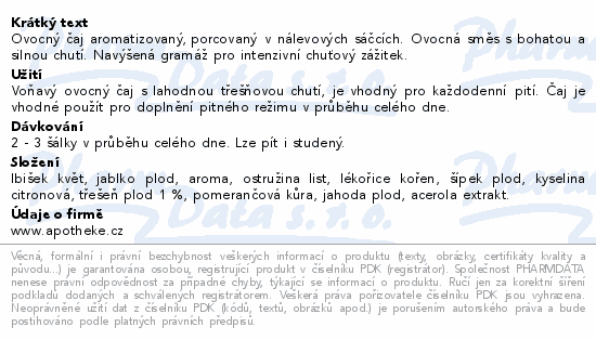 Ovocný čaj aromatizovaný, porcovaný v nálevových sáčcích. Ovocná směs s bohatou a silnou chutí. Navýšená gramáž pro intenzivní chuťový zážitek.
