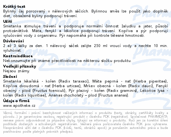 Bylinný čaj porcovaný v nálevových sáčcích. Bylinnou směs lze použít jako doplněk diet, obsažené byliny podporují trávení.