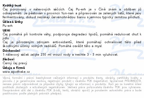 Čaj porcovaný v nálevových sáčcích. Čaj Pu-erh je v Číně znám a oblíben již odnepaměti. Je pěstován v provincii Yun-nan a připravován ze zelených listů, které jsou fermentovány, dokud nezískají červenohnědou barvu s jemnou typicky zemitou příchutí.