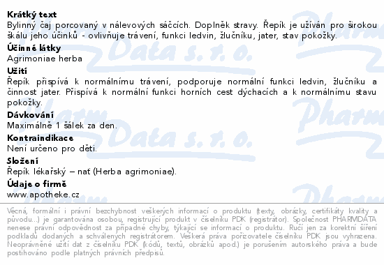 Bylinný čaj porcovaný v nálevových sáčcích. Doplněk stravy. Řepík je užíván pro širokou škálu jeho účinků - ovlivňuje trávení, funkci ledvin, žlučníku, jater, stav pokožky.