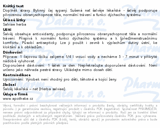 Doplněk stravy. Bylinný čaj sypaný. Sušená nať šalvěje lékařské - šalvěj podporuje přirozenou obranyschopnost těla, normální trávení a funkci dýchacího systému.
