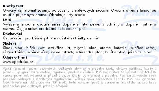 Ovocný čaj aromatizovaný, porcovaný v nálevových sáčcích. Ovocná směs s lahodnou chutí a příjemným aroma. Obsahuje listy stevie.