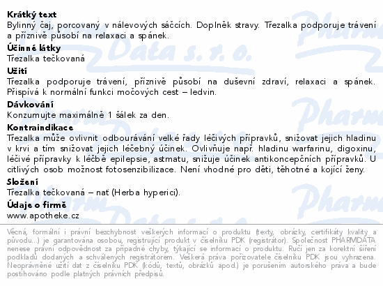 Bylinný čaj, porcovaný v nálevových sáčcích. Doplněk stravy. Třezalka podporuje trávení a příznivě působí na relaxaci a spánek.