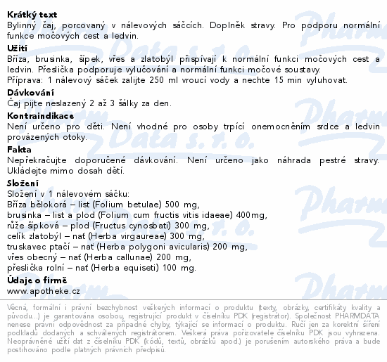 Bylinný čaj, porcovaný v nálevových sáčcích. Doplněk stravy. Pro podporu normální funkce močových cest a ledvin.
