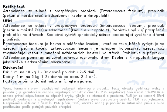Attabalance se skládá z prospěšných probiotik (Enterococcus faecium), prebiotik (pektin a mořská řasa) a adsorbencií (kaolin a klinoptilolit).