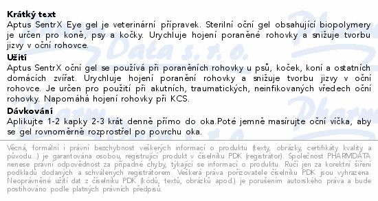 Aptus SentrX Eye gel je veterinární přípravek. Sterilní oční gel obsahující biopolymery je určen pro koně, psy a kočky. Urychluje hojení poraněné rohovky a snižuje tvorbu jizvy v oční rohovce.