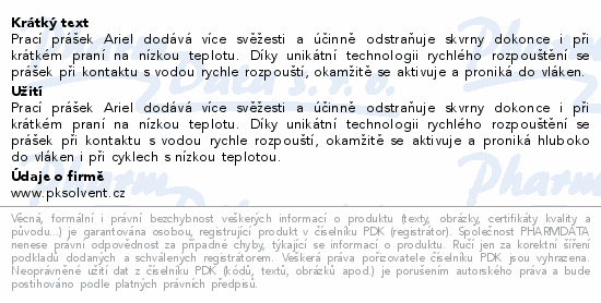 Prací prášek Ariel dodává více svěžesti a účinně odstraňuje skvrny dokonce i při krátkém praní na nízkou teplotu. Díky unikátní technologii rychlého rozpouštění se prášek při kontaktu s vodou rychle rozpouští, okamžitě se aktivuje a proniká do vláken.