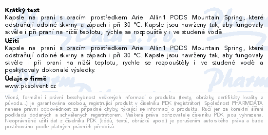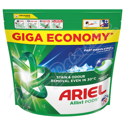 Kapsle na praní s pracím prostředkem Ariel Allin1 PODS Mountain Spring, které odstraňují odolné skvrny a zápach i při 30 °C. Kapsle jsou navrženy tak, aby fungovaly skvěle i při praní na nižší teplotu, rychle se rozpouštěly i ve studené vodě.