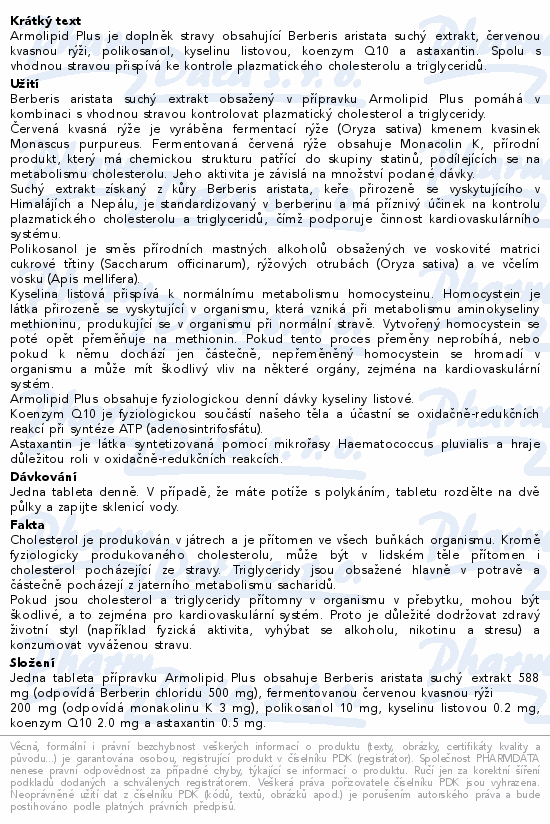 Armolipid Plus je doplněk stravy obsahující Berberis aristata suchý extrakt, červenou kvasnou rýži, polikosanol, kyselinu listovou, koenzym Q10 a astaxantin. Spolu s vhodnou stravou přispívá ke kontrole plazmatického cholesterolu a triglyceridů.