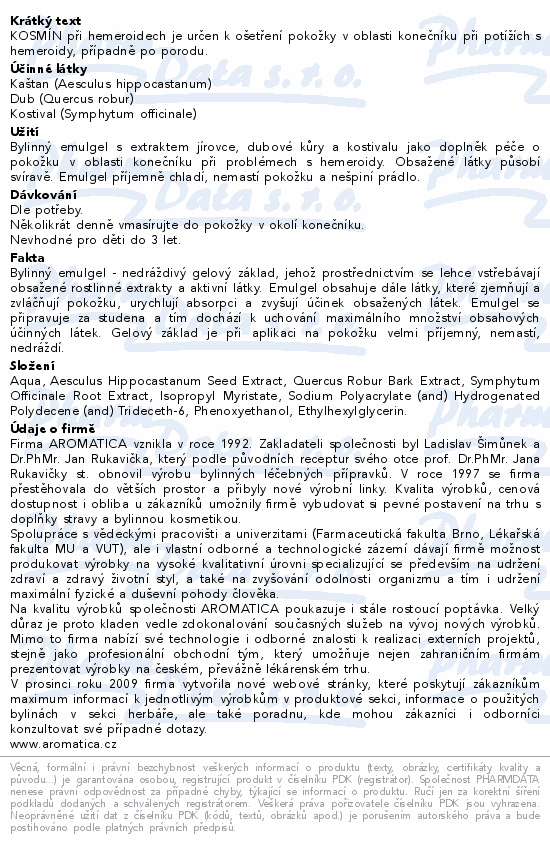 KOSMÍN při hemeroidech je určen k ošetření pokožky v oblasti konečníku při potížích s hemeroidy, případně po porodu.
