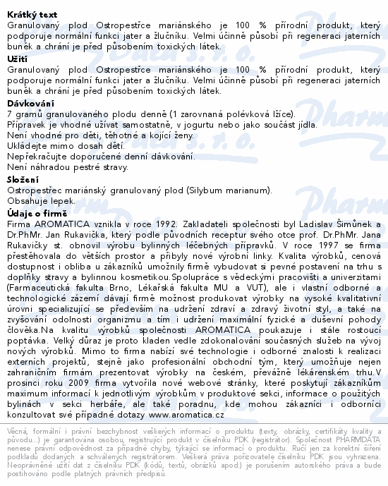 Granulovaný plod Ostropestřce mariánského je 100 % přírodní produkt, který podporuje normální funkci jater a žlučníku. Velmi účinně působí při regeneraci jaterních buněk a chrání je před působením toxických látek.