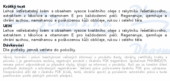 Lehce vstřebatelný krém s obsahem vysoce kvalitního oleje z rakytníku řešetlákového, extraktem z lékořice a vitaminem E pro každodenní péči. Regeneruje, zjemňuje a chrání suchou, namáhanou a poškozenou kůži obličeje, rukou i celého těla.