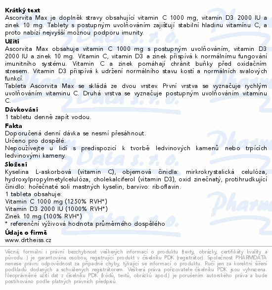 Ascorvita Max je doplněk stravy obsahující vitamin C 1000 mg, vitamin D3 2000 IU a zinek 10 mg. Tablety s postupným uvolňováním zajišťují stabilní hladinu vitamínu C, a proto nabízí nejvyšší možnou podporu imunity.