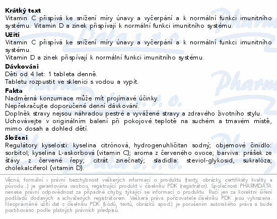 Vitamin C přispívá ke snížení míry únavy a vyčerpání a k normální funkci imunitního systému. Vitamin D a zinek přispívají k normální funkci imunitního systému.
