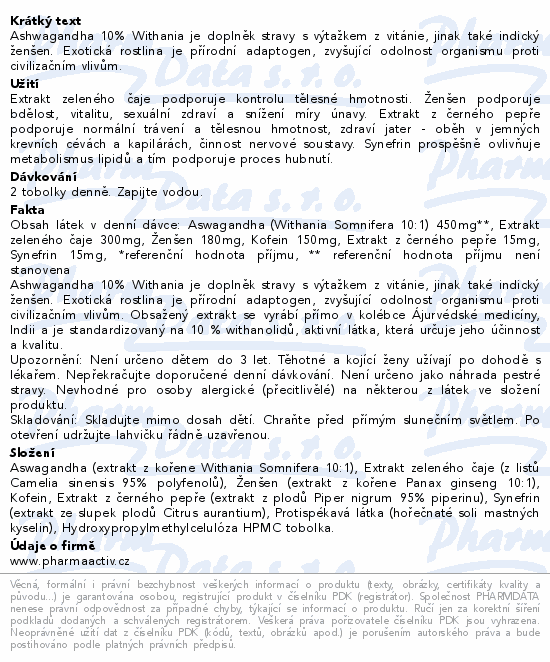 Ashwagandha 10% Withania je doplněk stravy s výtažkem z vitánie, jinak také indický ženšen. Exotická rostlina je přírodní adaptogen, zvyšující odolnost organismu proti civilizačním vlivům.