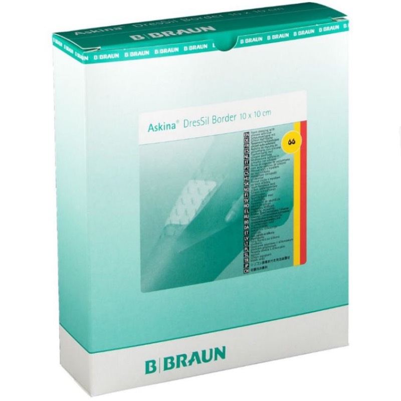 Askina DresSil Border je samoadhezivní pěnové krytí na rány, s měkkou silikonovou adhezivní vrstvou na jedné straně a paropropustnou vodotěsnou fólií na straně druhé. Kombinuje absorpční schopnosti pěny s měkkou přilnavostí silikonové kontaktní plochy. Při exsudaci pomáhá krytí Askina DresSil Border udržovat vlhké prostředí v ráně, které podporuje podmínky přirozeného hojení. Umožňuje účinnou léčbu rány a zvyšuje komfort pacienta bezbolestnou výměnou krytí.
