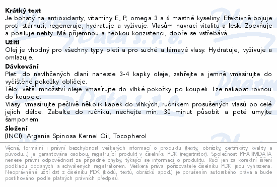Je bohatý na antioxidanty, vitamíny E, P, omega 3 a 6 mastné kyseliny. Efektivně bojuje proti stárnutí, regeneruje, hydratuje a vyživuje. Vlasům navrací vitalitu a lesk. Zpevňuje a posiluje nehty. Má příjemnou a hebkou konzistenci, dobře se vstřebává.