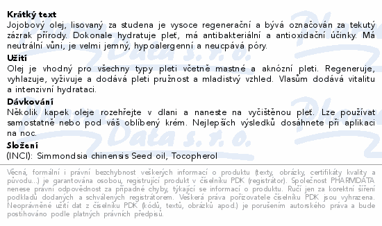 Jojobový olej, lisovaný za studena je vysoce regenerační a bývá označován za tekutý zázrak přírody. Dokonale hydratuje pleť, má antibakteriální a antioxidační účinky. Má neutrální vůni, je velmi jemný, hypoalergenní a neucpává póry.
