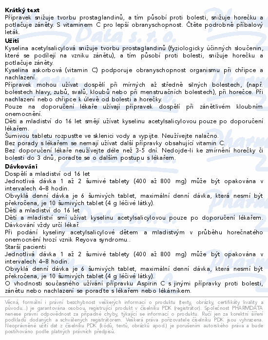 Přípravek snižuje tvorbu prostaglandinů, a tím působí proti bolesti, snižuje horečku a potlačuje záněty. S vitaminem C pro lepší obranyschopnost. Čtěte pozorně příbalový leták.