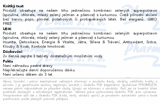 Produkt obsahuje na našem trhu jedinečnou kombinaci zelených superpotravin (spirulina, chlorela, mladý zelený ječmen a pšenice) s kurkumou. Čistě přírodní složení bez barviv, pojiv, plnidel, potahových či protispékavých látek. Bez alergenů. GMO FREE
