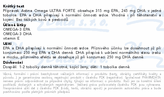 Přípravek Astina Omega ULTRA FORTE obsahuje 315 mg EPA, 245 mg DHA v jedné tobolce. EPA a DHA přispívají k normální činnosti srdce. Vhodná i při těhotenství a kojení. Bez těžkých kovů a pesticidů.