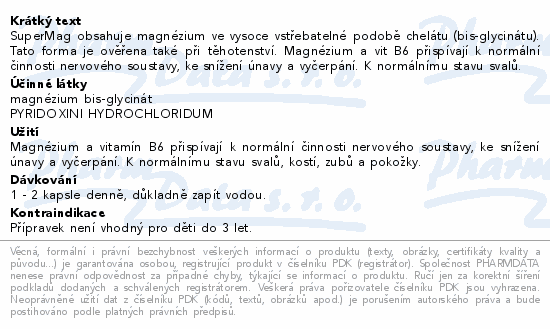 SuperMag obsahuje magnézium ve vysoce vstřebatelné podobě chelátu (bis-glycinátu). Tato forma je ověřena také při těhotenství. Magnézium a vit B6 přispívají k normální činnosti nervového soustavy, ke snížení únavy a vyčerpání. K normálnímu stavu svalů.