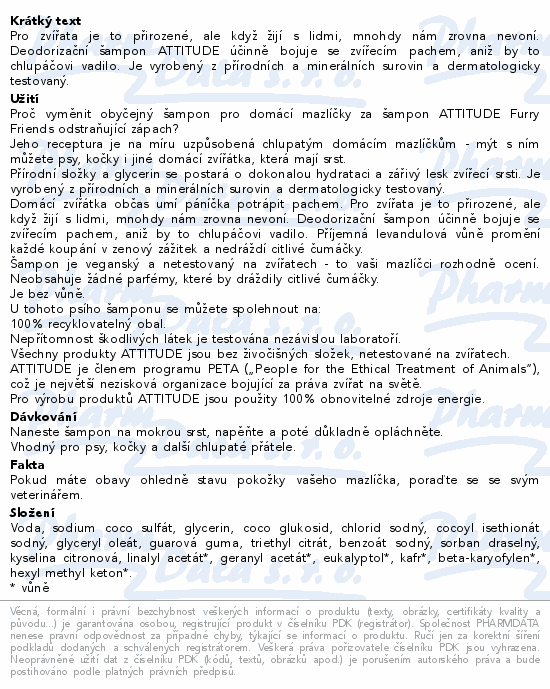 Pro zvířata je to přirozené, ale když žijí s lidmi, mnohdy nám zrovna nevoní. Deodorizační šampon ATTITUDE účinně bojuje se zvířecím pachem, aniž by to chlupáčovi vadilo. Je vyrobený z přírodních a minerálních surovin a dermatologicky testovaný.