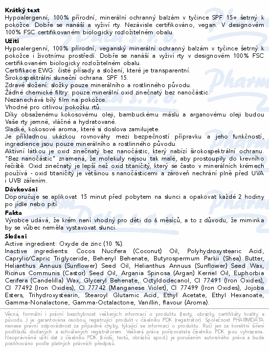 Hypoalergenní, 100% přírodní, minerální ochranný balzám v tyčince SPF 15+ šetrný k pokožce. Dobře se nanáší a vyživí rty. Nezávisle certifikováno, vegan. V designovém 100% FSC certifikovaném biologicky rozložitelném obalu.