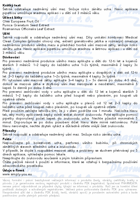 Šetrně odstraňuje nadměrný ušní maz. Snižuje riziko zánětu ucha. Navíc aplikace pipetkou umožňuje snadnou aplikaci i u dětí od 3 měsíců věku.