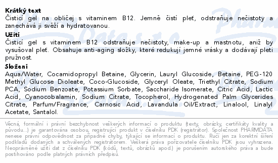 Čisticí gel na obličej s vitaminem B12. Jemně čistí pleť, odstraňuje nečistoty a zanechává ji svěží a hydratovanou.