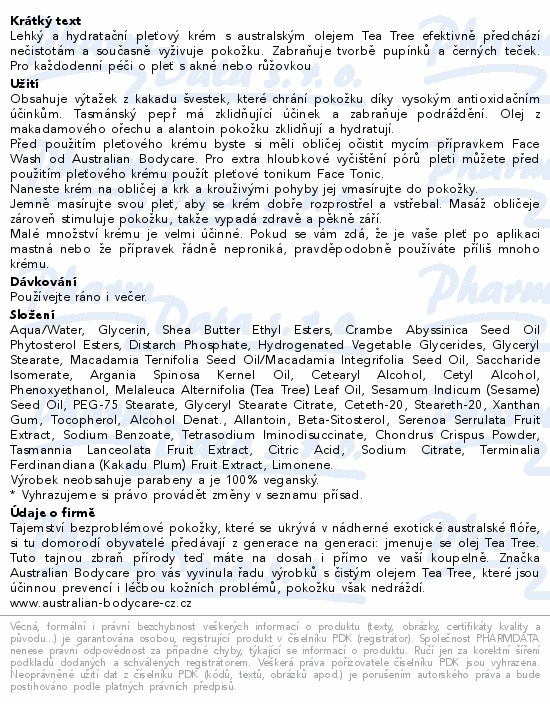 Lehký a hydratační pleťový krém s australským olejem Tea Tree efektivně předchází nečistotám a současně vyživuje pokožku. Zabraňuje tvorbě pupínků a černých teček. Pro každodenní péči o pleť s akné nebo růžovkou