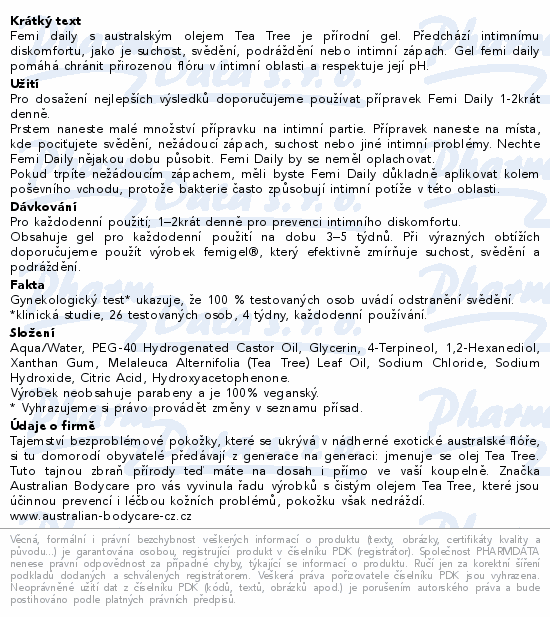 Femi daily s australským olejem Tea Tree je přírodní gel. Předchází intimnímu diskomfortu, jako je suchost, svědění, podráždění nebo intimní zápach. Gel femi daily pomáhá chránit přirozenou flóru v intimní oblasti a respektuje její pH.