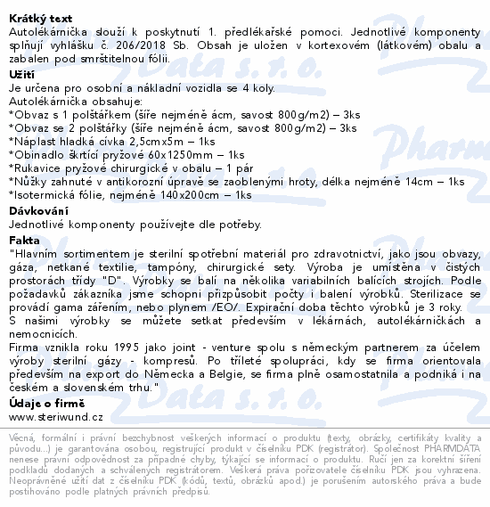 Autolékárnička slouží k poskytnutí 1. předlékařské pomoci. Jednotlivé komponenty splňují vyhlášku č. 206/2018 Sb. Obsah je uložen v kortexovém (látkovém) obalu a zabalen pod smrštitelnou fólii.