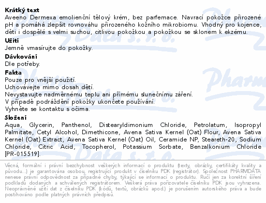 Aveeno Dermexa emolienční tělový krém, bez parfemace. Navrací pokožce přirozené pH a pomáhá zlepšit rovnováhu přirozeného kožního mikrobiomu. Vhodný pro kojence, děti i dospělé s velmi suchou, citlivou pokožkou a pokožkou se sklonem k ekzému.