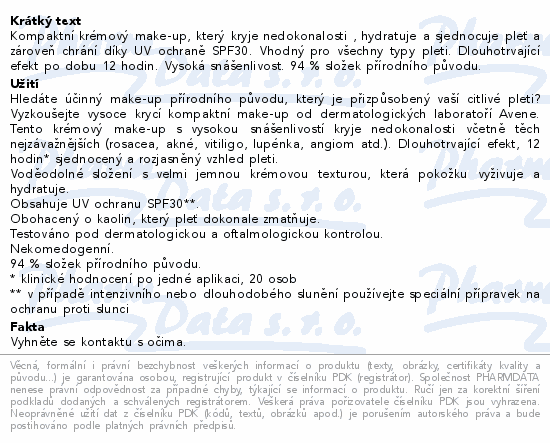 Kompaktní krémový make-up, který kryje nedokonalosti , hydratuje a sjednocuje pleť a zároveň chrání díky UV ochraně SPF30. Vhodný pro všechny typy pleti. Dlouhotrvající efekt po dobu 12 hodin. Vysoká snášenlivost. 94 % složek přírodního původu.