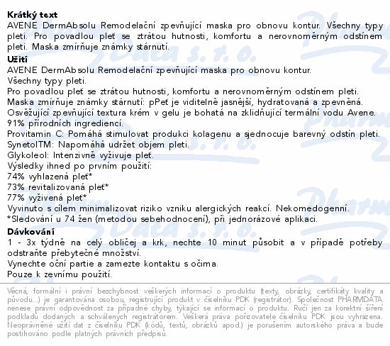 AVENE DermAbsolu Remodelační zpevňující maska pro obnovu kontur. Všechny typy pleti. Pro povadlou pleť se ztrátou hutnosti, komfortu a nerovnoměrným odstínem pleti. Maska zmírňuje známky stárnutí.