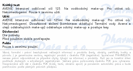 AVENE Intenzivní odličovač očí 125. Na voděodolný make-up. Pro citlivé oči. Nekomedogenní. Pouze k zevnímu užití.