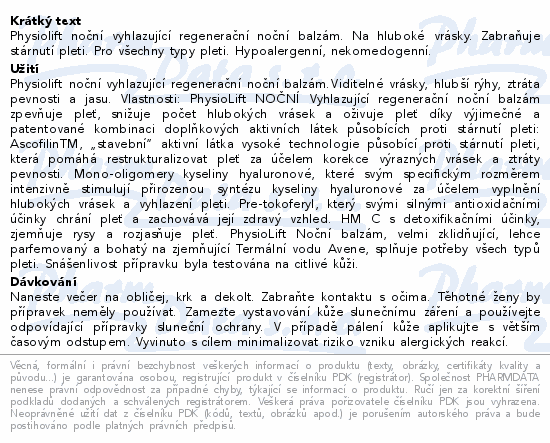 Physiolift noční vyhlazující regenerační noční balzám. Na hluboké vrásky. Zabraňuje stárnutí pleti. Pro všechny typy pleti. Hypoalergenní, nekomedogenní.