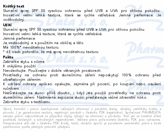 Sluneční sprej SPF 50 vysokou ochranou před UVB a UVA pro citlivou pokožku. Inovativní velmi lehká textura, která se rychle vstřebává. Jemná parfemace. Je voděodolný.
