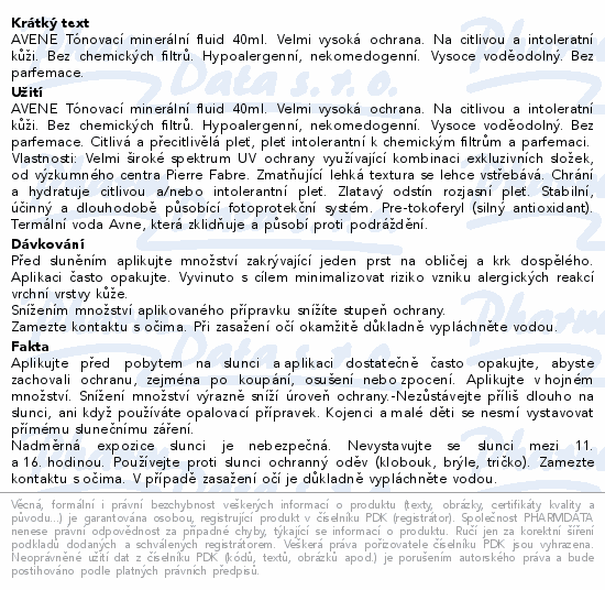 AVENE Tónovací minerální fluid 40ml. Velmi vysoká ochrana. Na citlivou a intoleratní kůži. Bez chemických filtrů. Hypoalergenní, nekomedogenní. Vysoce voděodolný. Bez parfemace.
