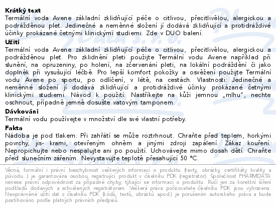 Termální voda Avene základní zklidňující péče o citlivou, přecitlivělou, alergickou a podrážděnou pleť. Jedinečné a neměnné složení jí dodává zklidňující a protidráždivé účinky prokázané četnými klinickými studiemi. Zde v DUO balení.