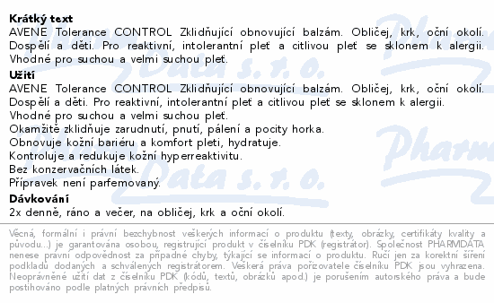 AVENE Tolerance CONTROL Zklidňující obnovující balzám. Obličej, krk, oční okolí. Dospělí a děti. Pro reaktivní, intolerantní pleť a citlivou pleť se sklonem k alergii. Vhodné pro suchou a velmi suchou pleť.