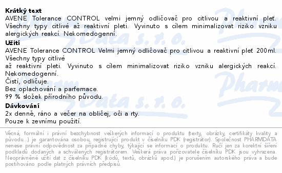 AVENE Tolerance CONTROL velmi jemný odličovač pro citlivou a reaktivní pleť. Všechny typy citlivé až reaktivní pleti. Vyvinuto s cílem minimalizovat riziko vzniku alergických reakcí. Nekomedogenní.