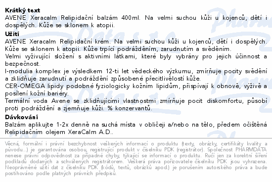AVENE Xeracalm Relipidační balzám 400ml. Na velmi suchou kůži u kojenců, dětí i dospělých. Kůže se sklonem k atopii.