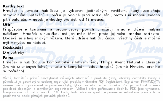 Hrneček s tvrdou hubičkou je vybaven jedinečným ventilem, který zabraňuje samovolnému vytékání. Hubička je odolná proti rozkousání, proto z ní mohou snadno pít i batolata. Hrneček je vhodný pro děti od 18 měsíců.