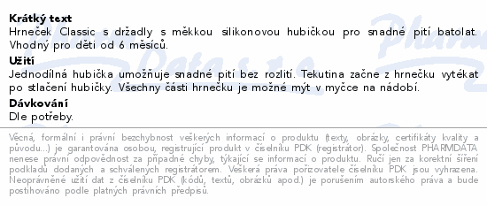 Hrneček Classic s držadly s měkkou silikonovou hubičkou pro snadné pití batolat. Vhodný pro děti od 6 měsíců.