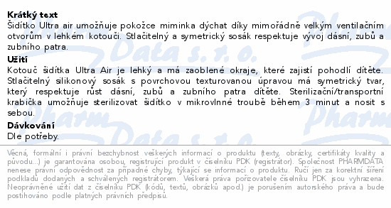 Šidítko Ultra air umožňuje pokožce miminka dýchat díky mimořádně velkým ventilačním otvorům v lehkém kotouči. Stlačitelný a symetrický sosák respektuje vývoj dásní, zubů a zubního patra.
