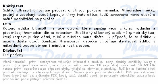 Šidítko Ultrasoft umožňuje pečovat o citlivou pokožku miminka. Mimořádně měkký, pružný a zaoblený kotouč kopíruje křivky tváře dítěte, tudíž zanechává méně otlaků a méně podráždění na pokožce.
