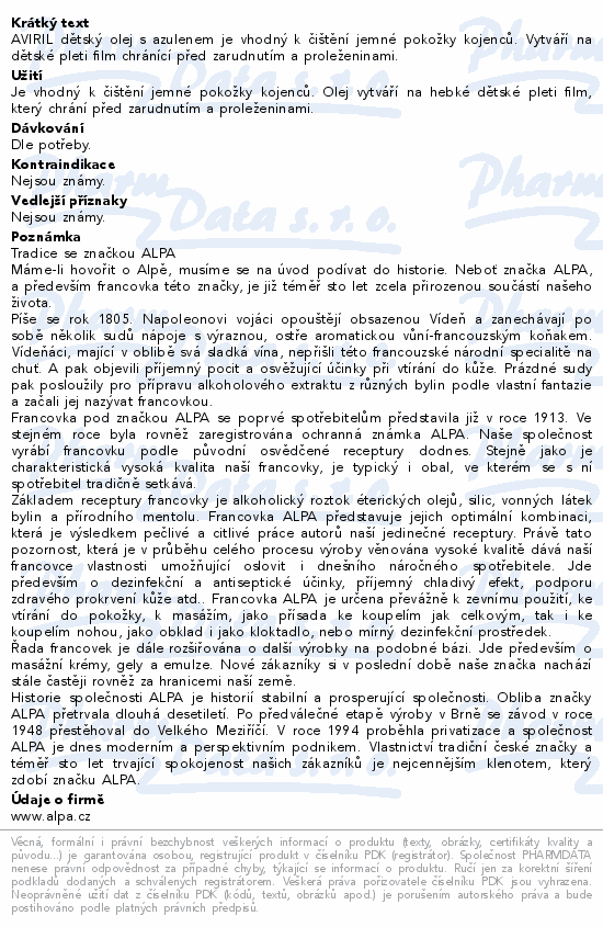 AVIRIL dětský olej s azulenem je vhodný k čištění jemné pokožky kojenců. Vytváří na dětské pleti film chránící před zarudnutím a proleženinami.