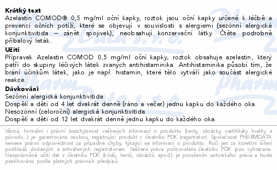 Azelastin COMOD® 0,5 mg/ml oční kapky, roztok jsou oční kapky určené k léčbě a prevenci očních potíží, které se objevují v souvislosti s alergiemi (sezónní alergická konjunktivitida – zánět spojivek), neobsahují konzervační látky. Čtěte pozorně příbalový leták.